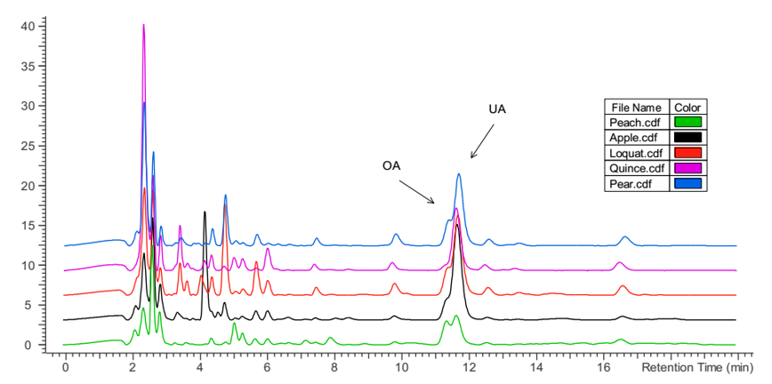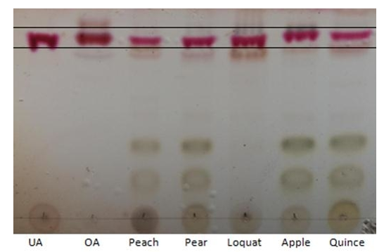In this study, the content of UA and OA present in the cuticular wax of the five most edible fruits (quince, loquat, pear, peach and apple) of the family Rosaceae was determined. Ursolic and oleanolic acid were the predominant triterpenes in the cuticular wax of these fruits, and the UA content were higher than OA in all samples.