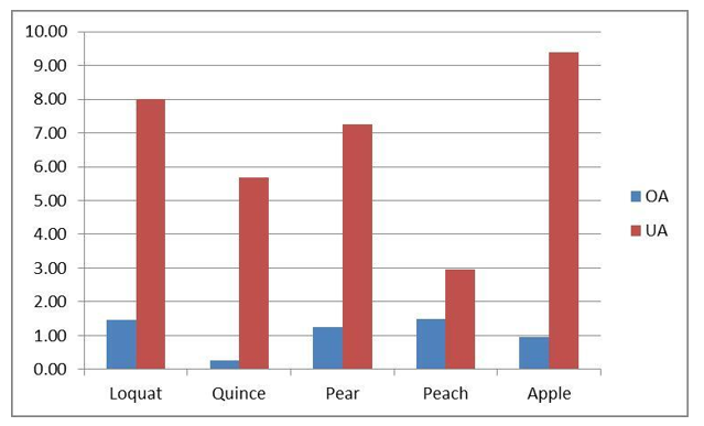 The results of the chromatographic analysis (Fig. 3) show that OA and UA acid were the main two active compounds in the skin of these five edible fruits. The concentration of UA ranged from 2.97 to 9.38 mg/g and that of OA from 0.25 to 1.49 mg/g (Table 1). The content of UA was significantly greater than that of OA in all cases (Fig. 4). The total content of these two triterpenes (UA+OA) is higher in the apple (10.34 mg/g) and lower in the peach (4.46 mg/g) (Fig. 5). The proportion of these two triterpenes (UA/OA) is higher in the quince (22.76) and less in the peach (1.99).
