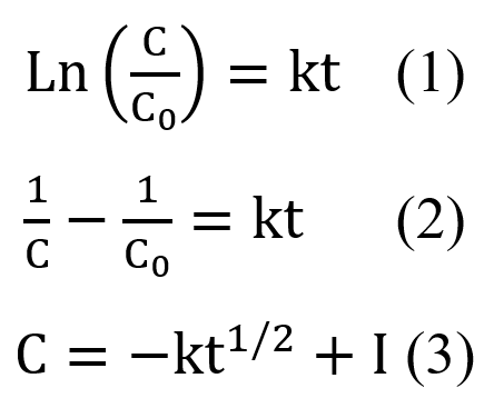 Donde C y C0 son las concentraciones para el tiempo t y tiempo 0, respectivamente; k es la constante cinética de la ecuación, la cual tiene unidades de min-1, para pseudo primer orden, de L mol-1·min-1 para la de pseudo segundo orden y de mol.L-1·min-1/2 para la intrapartícula.