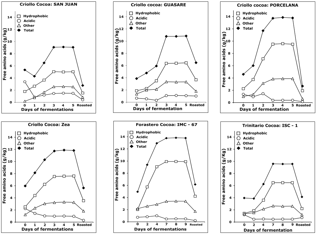 As was previously described, unfermented cocoa samples contained low amounts of free total amino acids, ranging between 2.33 and 5.97 g kg-1 (Table 2) and with a predominance of acidic amino acids, which represented 17 - 64%, 41 - 44%, and 30 - 38 % of the total amino acids content for Criollo, Forastero, and Trinitario, respectively. Variation of acidic, hydrophobic, and others amino acids during fermentation for all types of cocoa is detailed in Figure 6.