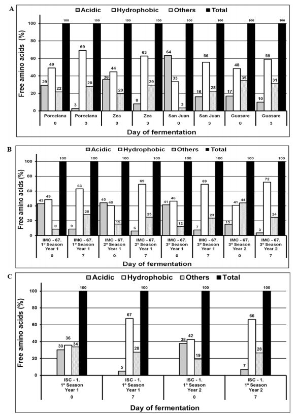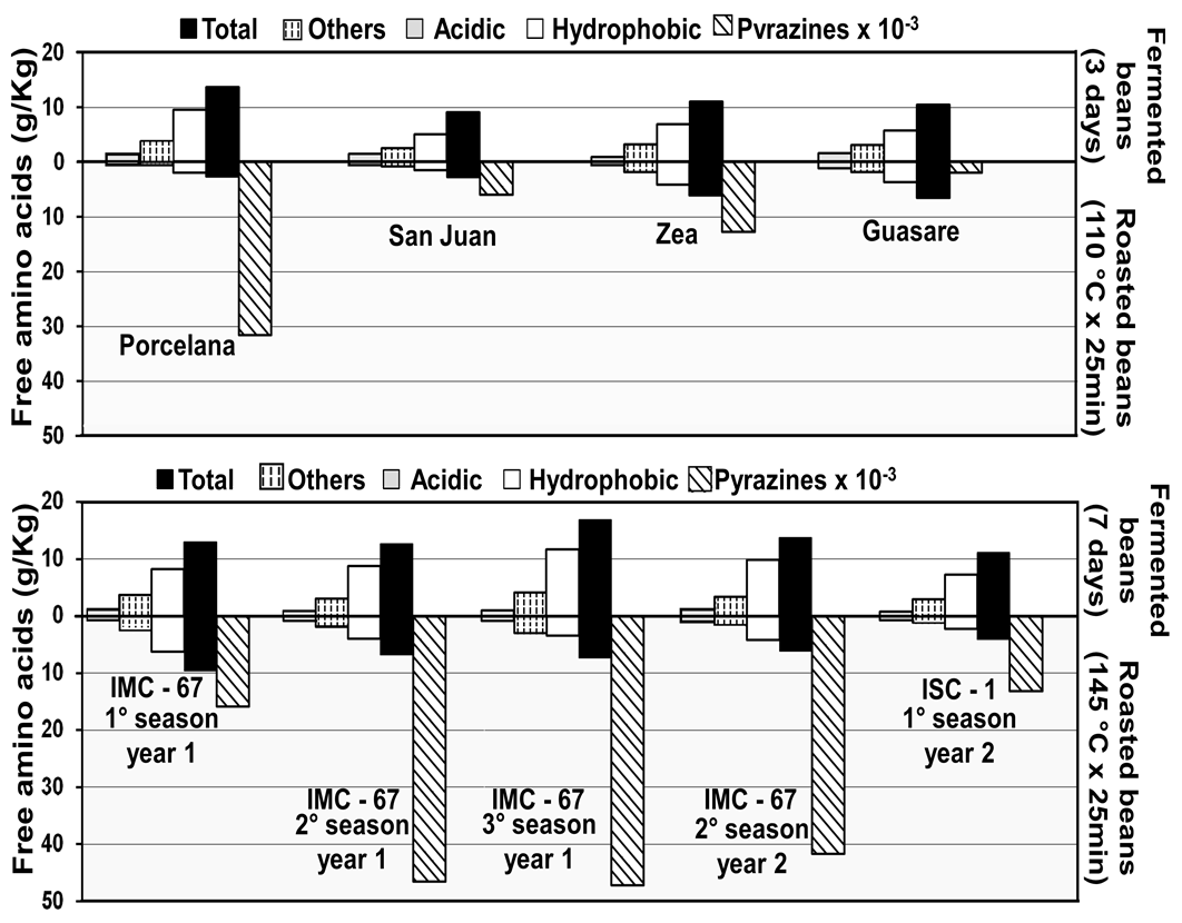 In contrast, fermented beans presented a higher amount of total free amino acids (9.05 - 16.9 g kg-1) with a significant increase of the hydrophobic amino acids content (56 - 72%) and a decrease of the acidic ones of more than 25%. For example, the cocoa beans of IMC-67 1st season, 1st year (Forastero) had an acid:hydrophobic:others amino acid ratio of 43:49:8 in unfermented beans and 9:63:28 in the fermented ones (Figure 6 b). This trend agrees with the results reported by other researchers [4, 11], which reported total free amino acid amounts within the range of 2.4 - 5.1 g kg-1 for unfermented cocoa beans with an acidic:hydrophopic:other ratio of 18:30:52, and 9.4 - 14.5 g kg-1 (6:46:48 and 58:16:26) for fermented cocoa beans from Malaysia and Ghana.