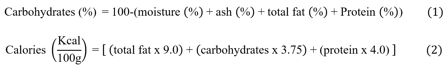 The proximal analysis was performed by the AOAC (Association of Analytical Chemists) standard methods. Moisture was determined by drying in an oven at 110 °C and quantifying by weight difference. The ashes were determined by ignition in a furnace at 550 °C and quantified by weight difference. The nitrogen content was quantified by the microkjeldahl method converting to total protein by the 6.25 factor. The fat content was carried out by extraction with hexane, in Soxhlet equipment, for 6 h; the fat was quantified by weight difference. The crude fiber was determined by acid hydrolysis followed by alkaline hydrolysis and finally burned at 550 °C. The content of fiber was calculated as the mass loss in the furnace. The carbohydrates were calculated by Eq. 1 and the energy (calories) through Eq. 2 [15].