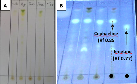 Figure 2. Detection of emetine and cephaeline in the extract of P. ipecacuanha plant by Thin Layer Chromatography. A. Visible light B. UV light. From left to right: stems, leaves, roots, cephaelin standard, and emetine standard.