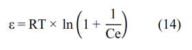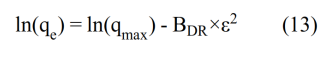 Donde qe es la capacidad de adsorción o cantidad de soluto adsorbido en el equilibrio (mg/g), ΒDR (mol2/kJ2) es la constante relacionada con la energía de adsorción, qmax es la capacidad máxima de saturación teórica (mg/g) y ε es el potencial de Polanyi, el cual es obtenido mediante la ecuación 14.