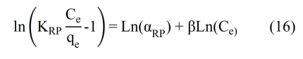 Donde qe es la capacidad de biosorción en el equilibrio Importar imagen, Ce es la concentración del soluto remanente en el equilibrio (mg/L), KRP (L/g) y αRP son las constantes de Redlich-Peterson, el valor de β varía entre 0 y 1, con dos comportamientos limitantes: cuando β=1, la ecuación 16 se reduce a la ecuación de Langmuir y, cuando β=0, la ecuación se transforma en la ecuación de Henry.