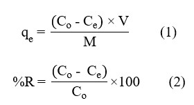 Donde Co y Ce son la concentración inicial y en equilibrio de iones de plomo (mg/L) en la solución, antes y después de la biosorción, respectivamente; M es la masa del biosorbente (g); V es el volumen de la solución (L).