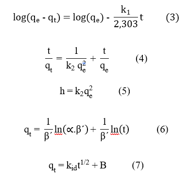 Donde qt y qe son las cantidades de ion plomo retenido por unidad de masa de biosorbente en un tiempo t y el retenido en el equilibrio, respectivamente (mg/g); k1 es la constante cinética del modelo de pseudo-primer orden (1/min); k2 (g/mg min) es la constante de velocidad del modelo de pseudo segundo orden; h es la tasa de sorción inicial (mg/g min); ∝ es la velocidad inicial de adsorción (mg/g min) y β’ está relacionada con la superficie cubierta y la energía de activación por quimisorción (g/mg); kid es la constante de velocidad de difusión intraparticular (mg/g min1/2) y B es una constante relacionada con el espesor de la capa límite del adsorbente (mg/g).
