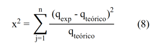 La prueba chi cuadrado no lineal (X2) [16] se usó como herramienta estadística para evaluar la precisión de los modelos cinéticos de adsorción, donde los valores de X2 de menor magnitud indican buena aproximación entre el modelo y los resultados experimentales. El valor de X2 fue calculado usando la ecuación 8.