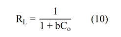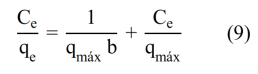 Donde qe es la capacidad de biosorción de Pb (II)en el equilibrio (mg/g); Ce es la concentración del Pb (II) en el equilibrio (mg/L), qmax y b son las constantes de Langmuir, relacionadas con la máxima capacidad de biosorción (mg/g) y la afinidad entre el sorbente y el sorbato (L/mg), respectivamente. Adicionalmente, se utilizó la constante adimensional llamada factor de separación (RL), según muestra la ecuación 10, donde el valor de RL describe la naturaleza del proceso de adsorción: no favorable (RL>1), lineal (RL=1), favorable (0<RL<1) o irreversible (RL=0).