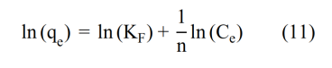 Donde qe es la capacidad de biosorción en el equilibrio (mg/g); Ce es la concentración de equilibrio del Pb (II) en la fase líquida (mg/L), Kf es la constante de equilibrio de la isoterma de Freundlich (mg/g(L/mg)1/n) y n es una constante adimensional relacionada con la afinidad entre el adsorbente y el adsorbato.