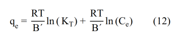 Donde qe es la capacidad de adsorción o cantidad de Pb (II) adsorbido en el equilibrio Importar imagen, R es la constante universal de los gases (kJ/mol K), T es la temperatura absoluta (K), KT es la constante de equilibrio de Temkin (L/g), Ce es la concentración del soluto en el equilibrio ( Importar imagen) y B´ es la variación de la energía de adsorción (J/mol).