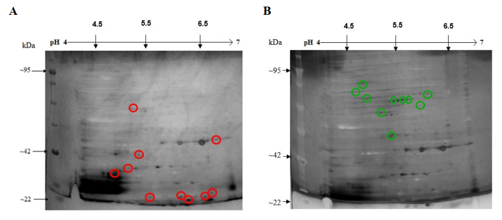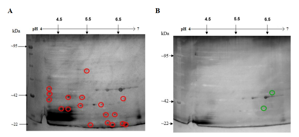 Figura 7. (A) Mapa bidimensional del proteoma control de E. coli O157:H7 ATCC 43888 después de 9 h de incubación. (B) Mapa bidimensional del proteoma control de E. coli O157:H7 ATCC 43888 después de 9 h de incubación con IONPs. Los círculos rojos evidencian manchas inhibidas bajo tratamiento y los círculos verdes son manchas expresadas bajo tratamiento.