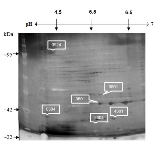 Figura 6. Mapa bidimensional del proteoma de E. coli O157:H7 ATCC 43888 después de 9 h de incubación con tratamiento IONP@Ib-M1. Se encuentran enmarcadas aquellas proteínas que estuvieron presentes tanto en el perfil de proteínas control como en el perfil de proteínas del tratamiento con IONP@Ib-M1 y que presentaron diferencias estadísticamente significativas (p ≤0,05).