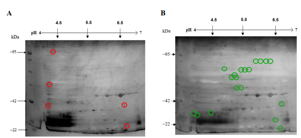 Figura 3. (A) Mapa bidimensional del proteoma control de E. coli O157:H7 ATCC 43888 después de 9 h de incubación. (B) Mapa bidimensional del proteoma control de E. coli O157:H7 ATCC 43888 después de 9 h de incubación con Ib-M1. Los círculos rojos evidencian manchas inhibidas bajo tratamiento y los círculos verdes son manchas expresadas bajo tratamiento.