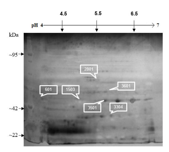 Figura 4. Mapa bidimensional del proteoma de E. coli O157:H7 ATCC 43888 después de 9 h de incubación con tratamiento Ib-M1. Se encuentran enmarcadas aquellas proteínas que estuvieron presentes tanto en el perfil de proteínas control como en el perfil de proteínas del tratamiento con Ib-M1 y que presentaron diferencias estadísticamente significativas (p ≤0,05).