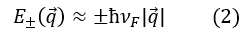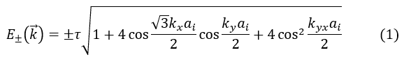 donde ai = √3a y τ es la integral de transferencia (salto de energía entre vecinos más cercanos, con un valor típico de 2,9 a 3,1 eV) [47]. La ecuación (1) cerca de los puntos de Dirac conduce a la siguiente dispersión para bajas energías: