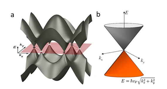 Como consecuencia de la estructura reticular hexagonal del grafeno (figura 4c), su primera zona de Brillouin tiene dos puntos no equivalentes, los llamados puntos Dirac, que se tocan en un solo punto (figura 1). Su nombre deriva de la estructura de banda lineal descrita por la ecuación de Dirac para Fermiones sin masa [45]. Usando el hamiltoniano [46] de unión estrecha, que considera solo la primera interacción vecina más cercana, para calcular la relación de dispersión de los electrones cerca de los dos puntos de Dirac (K, K´), se produce la siguiente dispersión de banda: