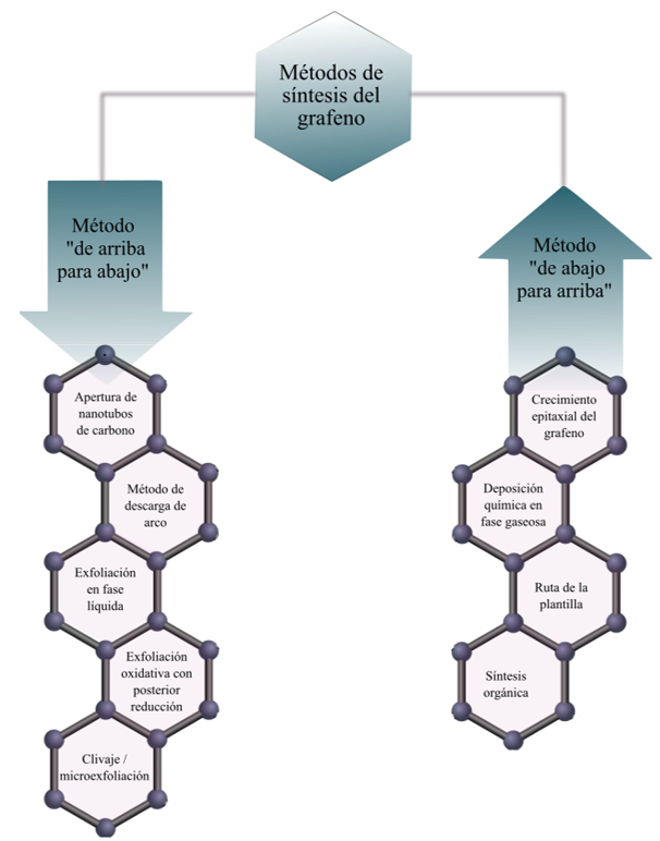 Diferentes métodos de producción han sido estudiados en el grafeno, por ejemplo: deposición química en fase vapor, exfoliación micromecánica, molienda de bolas, exfoliación electroquímica, crecimiento epitaxial a partir de carburo de silicio, entre otros [27-30] (en la figura 2 se muestra un resumen de las principales metodologías). Kum et al. [31] en su revisión bibliográfica hablan de la realidad actual y de la industrialización del grafeno, incluso muestran que en los últimos años se producen miles de toneladas de grafeno anualmente. La publicación conocida como White book o libro de cocina del grafeno [32] es un compendio de la producción y el procesado del grafeno de diversos y punteros grupos europeos, todos ellos pertenecientes al proyecto europeo Graphene Flagship, que comenzó en 2013 y en el que Europa ha invertido un billón de euros [33].