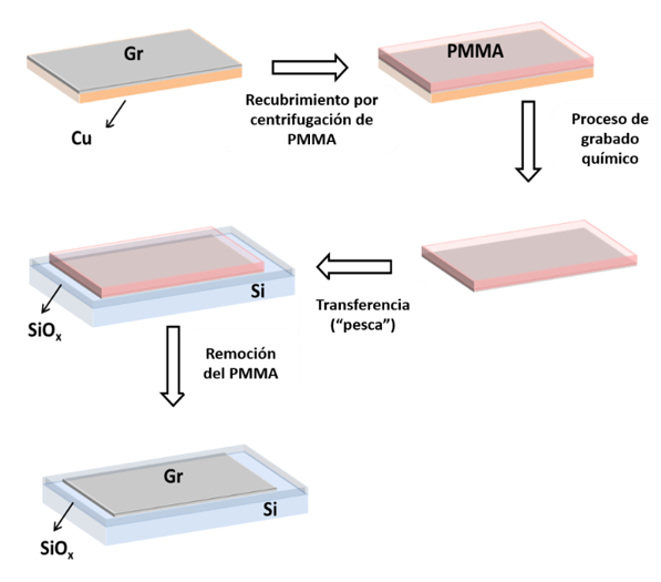 El método más utilizado de transferencia es el “método de transferencia húmeda” (figura 3), en este el grafeno se deposita sobre el sustrato polimetilmetacrilato (PMMA) como soporte mecánico y de esta manera se minimiza la formación de arrugas en la lámina, lo que conduce a una mejor calidad del grafeno transferido [39]. El apilamiento PMMA/grafeno/Cu se coloca luego sobre una solución de grabado (generalmente persulfato de amonio o ácido clorhídrico con peróxido de hidrógeno). Después de la corrosión completa del cobre, la muestra se recoge desde abajo con un portaobjetos de vidrio y se pone en agua desionizada para eliminar todos los residuos. Finalmente, el grafeno cubierto con PMMA se extrae con el sustrato objetivo, seguido de la eliminación del PMMA por medio de acetona.