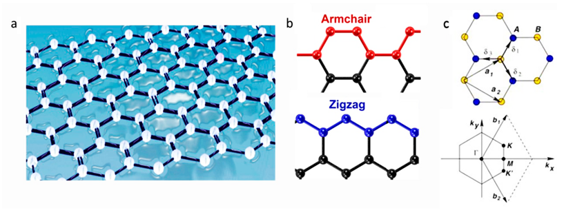 Figura 4. a) Representación esquemática de la red de panal de grafeno. b) Dos terminaciones de grafeno diferentes, “armchair” (imagen superior) y “zigzag” (imagen inferior). c) Estructura reticular real y recíproca del grafeno. La primera zona de Brillouin comprende los puntos de alta simetría Γ, M, K y K´.
