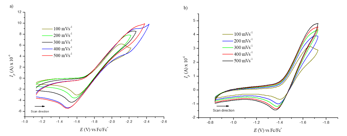 Figure 9. Cyclic voltammetry of the first peak reduction at different scan rates for a) compound (3) C60 monoadduct and b) compound (5) C70 monoadduct.