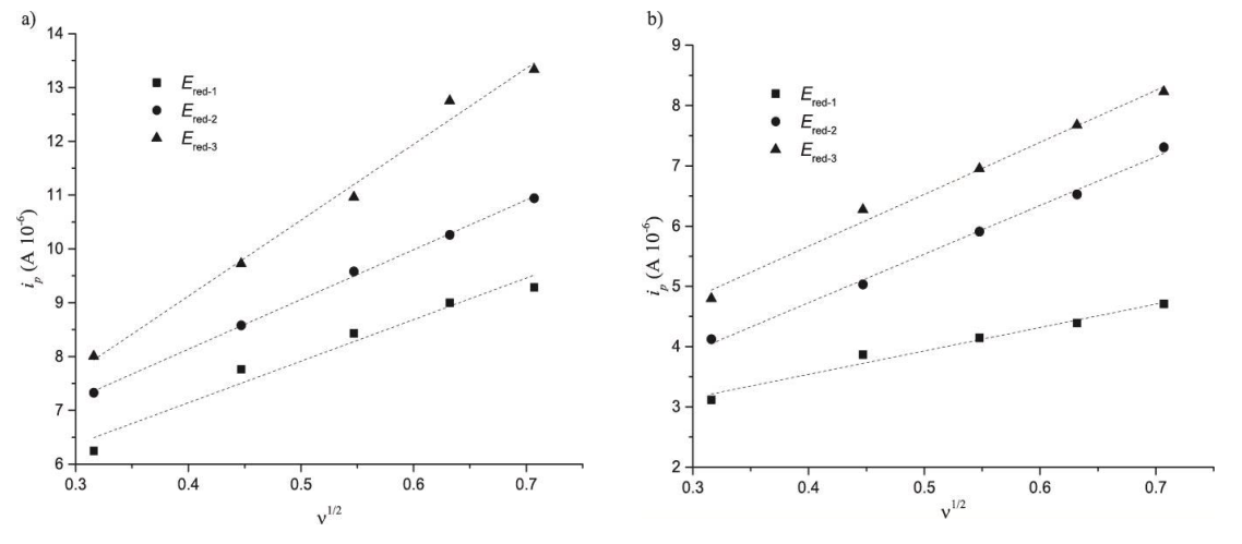 Figure 10. Dependence of the current peak with the square of the scan rate for each reduction potential of a) compound (3) C60 monoadduct and b) compound (5) C70 monoadduct.