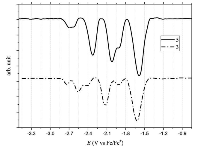 Figure 11. Osteryoung Square Wave Voltammetry in 0.05M TBAPF6/o-DCB of compound (3) C60 monoadduct and compound (5) C70 monoadduct.