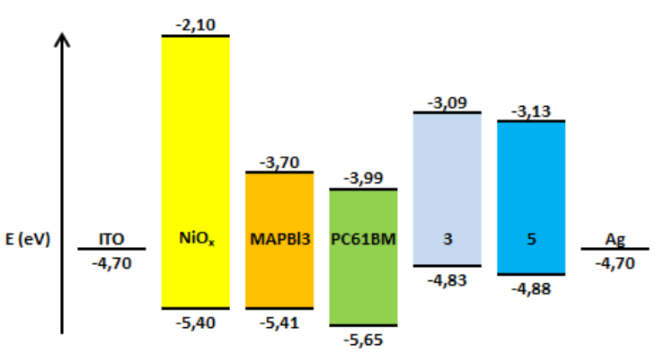 The results from the electrochemistry combined with the UV-Vis characteristics allowed us to obtain the work function for the compounds (3) and (5), which is vital information to determine whether they are suitable or not to be used as an ETL in PSCs. HOMO and LUMO values of compounds (3) and (5) are summarized in Table 4. Figure 12 shows that HOMO-LUMO values of the compounds (3) and (5) do not match very well with those of the perovskite layer, which can lead to an inefficient hole blocking process and hysteresis behavior in the PSCs. This phenomenon makes part of the experimental work in the understanding of charge generation at organic heterojunctions and charge separation. High-level theoretical calculations as semiempirical and density functional molecular calculations could be carried out in order to understand the dynamics of charge pair generation and correlate the theoretical LUMOs with the open circuit voltage of the photovoltaic device [48,49].