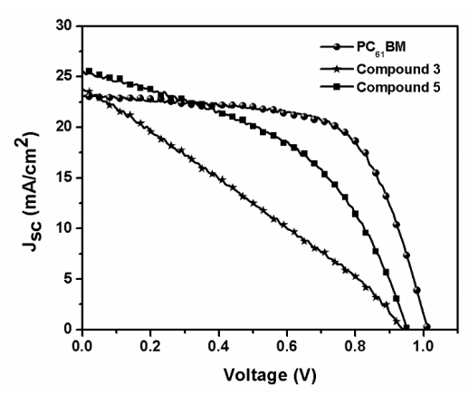 Figure 13. control PC61BM, compound (3) C60 monoadduct and compound (5) C70 monoadduct J-V curves.