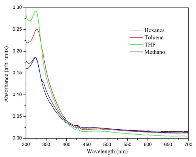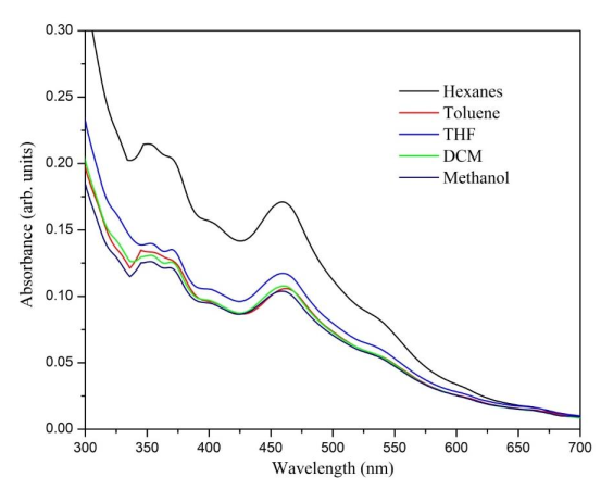 Figure 2. UV-Vis absorption spectra recorded of the compound (3) C60 monoadduct in different solvents.