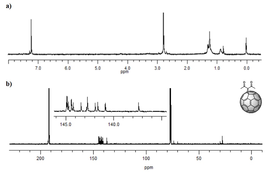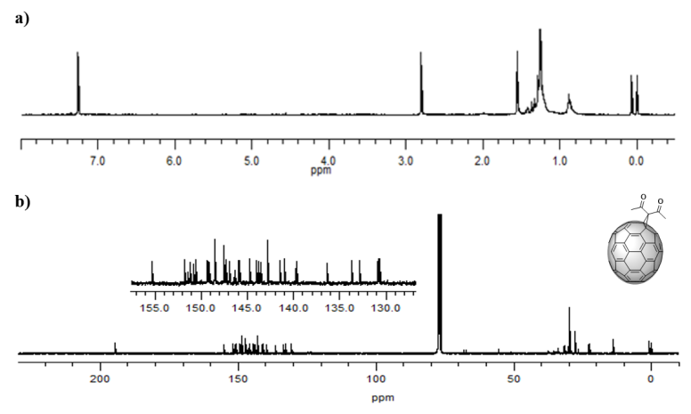 The identity of product (3) was confirmed with the information provided by the nuclear magnetic resonance spectrum. 1H spectrum (Figure 4 a) showed a singlet at 2.84 ppm generated by the methyl protons of the carbon directly bonded to the carbonyl. The 13C spectrum (Figure 4 b) also showed the expected signals. Cycloaddition of a symmetric fragment along the 6,6 bond results in a 13C-NMR spectrum of such a cycloadduct containing 17 peaks of fullerene carbon atoms. Among these, it was possible to observe that σ 70–90 ppm is typical for sp3 hybridized atoms, and the other 16 localized between 137 and 160 ppm are characteristic of the sp2 fullerene carbon atoms.