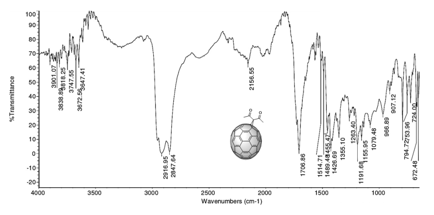 By employing 100 mg (0.14 mmol) of C60, 7.23 μL (0.07 mmol) of acetylacetone, 23.21 mg (0.07 mmol) of CBr4 and 10.47 μL (0.07 mmol) of DBU, 39.5 mg (0.04 mmol, 69%) of the monoadduct was obtained (3), C65H6O2 (818.65 g/mol) as a brown solid. Rf: 0.62, IR(ATR): n (cm-1): 2920, 2849, 1708, 1646, 1461, 1427; 1H-NMR (400 MHz, CS2/CDCl3): δ (ppm) 2.84 (s,6 H); 13C-NMR (100 MHz, CS2/CDCl3): δ (ppm) 193.44, 144.53, 145.25, 145.10, 144.80, 144.76, 144.61, 143.79, 143.22, 143.11, 142.32, 142.04, 141.26, 137.77, 74.10, 70.37, 28.12; UV-Vis (CHCl3) l (nm): 680, 425, 488. Expected exact mass: 818.7, experimental m/z: 818.1.