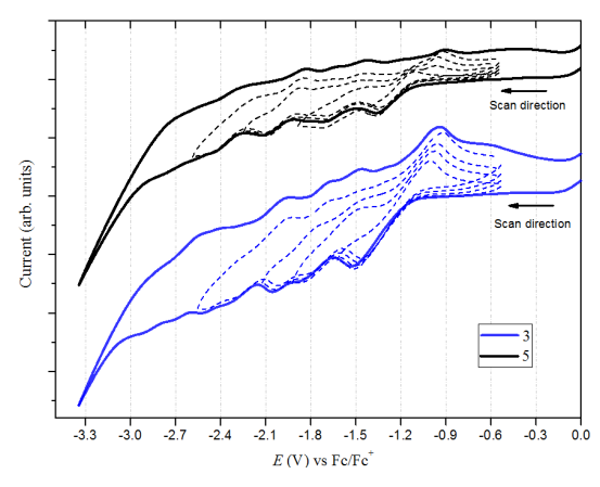 Previous studies reported that Bingel derivatives of C60 and C70 exhibit quasi and reversible cathodic electrochemical behavior [39–41] CV of C60-diacetylmethane (3) and C70-diacetylmethane (5) compounds were recorded at a scan rate of 100 mV/s (Table 1 and Figure 8). Compound (3) exhibits seven irreversible reduction peaks in which four are well-defined. Based on their shape and current intensity, these are likely to be monoelectronic. On the other hand, compound (5) exhibits six reduction events. Four of these were well-defined, and as with compound (3), all the peaks are irreversible and monoelectronic. No oxidation events were observed for either compound—at least none within the work potential window.