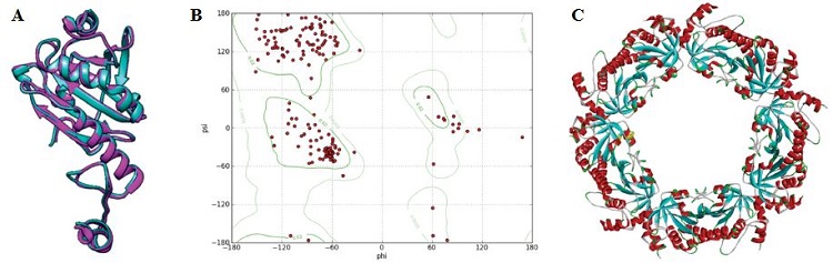 Por otro lado, con respecto al análisis in silico del candidato encontrado, el servidor I-TASSER se utilizó para realizar la predicción tridimensional de la estructura de la proteína LbTXNPxII (Figura 2 A.), este emplea el método de “Threading” partiendo de una estructura cristalizada seleccionada mediante homología [37], [39], [46], [47]. Al valorar dicho modelo mediante el gráfico de Ramachandran, se obtuvo el 94,4% de los aminoácidos que componen la proteína en la región favorecida, luego de que el modelo se refinó mediante el servidor 3Drefine [48] (Figura 2.B.). Por último, partiendo de análisis de oligomerización realizados en L. mayor, donde se predice una posible formación de homodecámeros in vivo para llevar a cabo su función, se utilizaron los servidores SWISS-MODEL y GalaxyHomomer a fin de realizar este análisis para el candidato LbTXNPxII, obteniendo la posible formación de un pentámero de homodímeros, conformando finalmente, una estructura cuaternaria de homodecámeros (Figura 2. C.) [41], [49], [50].