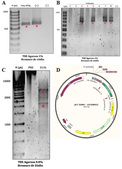La secuencia LbTXNPxII de 600 pb se amplificó a partir de ADN genómico mediante PCR con Taq polimerasa (Figura 3. A.). Posteriormente, el producto amplificado se clonó en el vector de expresión bacteriano pET-SUMO. Al tratarse de un vector tipo -TA-, la direccionalidad del inserto se corroboró realizando PCR con un oligonucleótido directo ubicado en la región SUMO corriente arriba del sitio de clonación múltiple, junto con el oligonucleótido reverso diseñado para la amplificación del candidato, esperando así un aumento en el tamaño del amplificado de 100 pb; es decir, una banda de alrededor de 700 pb (Figura 3 B.). Finalmente, utilizando el servidor NEBcutter2.0 se seleccionaron las enzimas de restricción (BamHI y EcoRV) para corroborar la identidad del plásmido recombinante mediante un perfil diferencial en comparación con el plásmido vacío (Figura 3 C.) [22]. El mapa del vector recombinante construido se indica en la Figura 3. D.