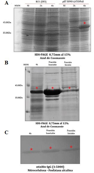 Tras la corroboración de la identidad del plásmido pET SUMO- LbTXNPxII, este se utilizó para la transformación de la cepa de expresión BL21(DE3) [51]. Posterior a la inducción con IPTG se encontró que a partir de las 2 h se observa en el SDS-PAGE una evidente expresión de la proteína en el peso esperado (37 kDa) (Figura 4 A.); sin embargo, teniendo en cuenta que a las 4 h se observa una mayor cantidad, este tiempo se implementó para realizar el fraccionamiento celular (Figura 4. B.). Finalmente, al realizar la detección de la 6xHis-SUMO-LbTXNPxII mediante Western blot, se obtuvo señal tanto en la fracción soluble como insoluble del sistema de expresión (Figura 4 C.).