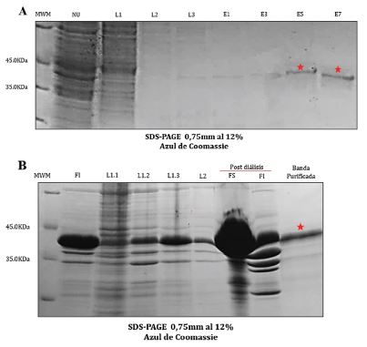 La expresión de la proteína recombinante se evaluó mediante electroforesis vertical en condiciones desnaturalizantes (SDS–PAGE) utilizando el sistema MGV-402 (CBS Scientific). Se trató una alícuota de las muestras (totales, solubles e insolubles) resuspendiéndolas con buffer carga 6X (tris HCl 0,5 M pH 6,8, glicerol 30%, SDS 10%, β-mercaptoetanol 33% y azul de bromofenol 0,4 mg/mL) en relación 1:5 y desnaturalizándolas a 92 °C por 10 min. Se utilizaron geles de poliacrilamida discontinuos de gel separador al 12% (acrilamida 30% Merck: 29 g acrilamida + 1 g bisacrilamida [Promega]) y gel concentrador al 4% (acrilamida 30%: 29 g acrilamida + 1 g bisacrilamida). Las muestras se separaron a 100 V constantemente, siendo visualizadas con azul de Coomassie G250: tiñendo el gel por 45 min y luego decolorando en solución de ácido acético (99%) y 2-propanol (99%) en proporción 1:1. Con el fin de realizar la identificación de la proteína expresada mediante Western blot, y aprovechando la etiqueta 6xHis provista por el vector, las muestras provenientes del cultivo celular se separaron por SDS-PAGE y se electrotransfirieron hacia membrana de nitrocelulosa (Thermo Scientific) en buffer de transferencia (tris base 25 mM, glicina 192 mM y metanol 10%, pH 8,3) a 200 mA durante 2 h en el sistema EBX-700 (CBS Scientific) [24]. La membrana se bloqueó con TBS-T Leche 5% (tris-HCl 20 mM pH 7,5, NaCl 150 mM y Tween 20 0,1%) durante 2 h. Seguidamente, se adicionó el anticuerpo primario α6xHis-mouse (1:5000) (Abcam) preparado en TBS-T, permitiendo su interacción con la membrana por 2 h, luego se agregó el anticuerpo secundario αmouse-fosfatasa alcalina (1:10000) (Invitrogen) preparado en TBS-T durante 1 h y, finalmente, se reveló con 16,5 µL NBT (S380C Promega) y 16,5 µL NBCIP (S381C Promega) en 5 mL de buffer sustrato fosfatasa alcalina (Tris-HCl 100 mM pH 9,0, NaCl 150 mM y MgCl. 1 mM), la reacción se detuvo con H2O. En cada paso la membrana se lavó 3 veces durante 10 min con TBS-T [25]. Se utilizó marcador de peso molecular (Thermo Scientific 26610) y tanto geles como membranas se foto-documentaron con el sistema Gel Doc XR (BioRad).