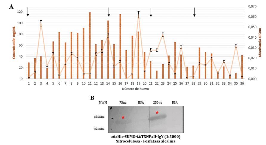 El modelo aviar permite la obtención de los anticuerpos policlonales de interés tanto a partir de sangrías del animal como de los huevos que este produce. Durante el esquema de inmunización realizado se recolectaron 36 huevos. Posterior a su procesamiento, las muestras se analizaron por espectrofotometría (280 nm) con el propósito de estimar la concentración aproximada (mg/mL) de proteínas totales presentes en cada una. Seguidamente, se realizó la titulación de estas mediante ELISA indirecto, en el cual se determinaron las muestras con mayor cantidad de anticuerpos específicos contra la 6xHis-SUMO-LbTXNPxII, seleccionadas para la completa purificación. Es evidente que las muestras que presentan mayor concentración de proteínas totales no necesariamente son las que poseen mayor cantidad de los anticuerpos de interés; adicionalmente, existe una clara respuesta del sistema ante la inoculación, observándose los picos más altos (Abs 405 nm) posterior a esta (Figura 7. A). Finalmente, los anticuerpos α6xHis-SUMO-LbTXNPxII-IgY purificados a partir de la yema de los huevos se evaluaron mediante Western blot, obteniendo señales claras y específicas en el reconocimiento de la proteína recombinante (Figura 7 B).