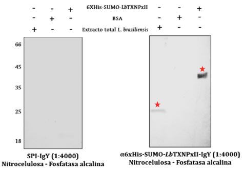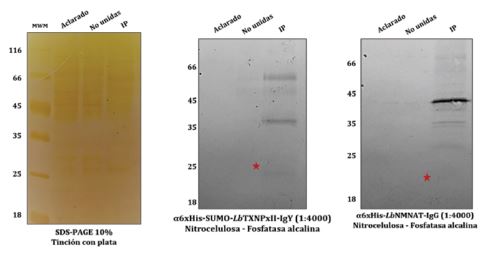 Análisis realizados por Joya et al. en el 2019 por Co-IP/MS-MS sugirieron una posible interacción entre la triparedoxina peroxidasa (TXNPxII) y la nicotinamida/nicotinato mononucleótido adenililtransferasa (NMNAT), enzima clave en el metabolismo del dinucleótido de nicotinamida y adenina NAD en L. braziliensis. Para corroborar dicha interacción, los anticuerpos policlonales α6xHis-SUMO-LbTXNPxII-IgY generados se utilizaron en la inmunoprecipitación e inmunodetección cruzada de estas enzimas, observándose para cada caso la detección de estas (Figura 10), confirmando esta conexión molecular.