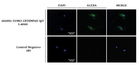 Otra manera de aprovechar los anticuerpos policlonales IgY específicos contra la proteína 6xHis-SUMO-LbTXNPxII, producidos en el modelo aviar en la inmunodetección de la proteína endógena, es por medio de inmunofluorescencia; para ello, promastigotes de L. braziliensis provenientes de 1 mL de cultivo confluente se centrifugaron (5000 rpm por 5 min a 4 ºC) y lavaron 3 veces con volúmenes con 1 mL de PBS 1X (homogenizando suavemente), siendo finalmente resuspendidos en 300 µL. Cerca de 2x106 parásitos se aplicaron sobre laminas tratadas con poli-L-lisina fijados con paraformaldehído 4% preparado en PBS 1X (1 h a 4 ºC). Posteriormente, se adicionó glicina fría 100 mM durante 15 min y se permeabilizó con acetona fría durante 10 min a 4 ºC. El montaje se bloqueó empleando BSA 1% en PBS 1X durante 1 h, luego se permitió interacción con el anticuerpo primario α6xHis-SUMO-LbTXNPxII purificado (1 h a temperatura ambiente), diluido 1:1000 en solución de bloqueo. El anticuerpo secundario αIgY acoplado a Alexa 488 (1:1000 en solución de bloqueo) (Invitrogen) se aplicó sobre las láminas durante 1 h en oscuridad. La marcación del ADN se realizó con DAPI (1 µg/ml en PBS 1X) (Thermo Scientific) durante 5 min. Entre cada paso las láminas se lavaron una vez con PBS 1X durante 10 min. Finalmente, las láminas se cubrieron con medio de montaje (Fluoromont-G – Invitrogen) y se visualizaron empleando el microscopio Nikon Eclipse C1 Plus y el Software EZ-C1.