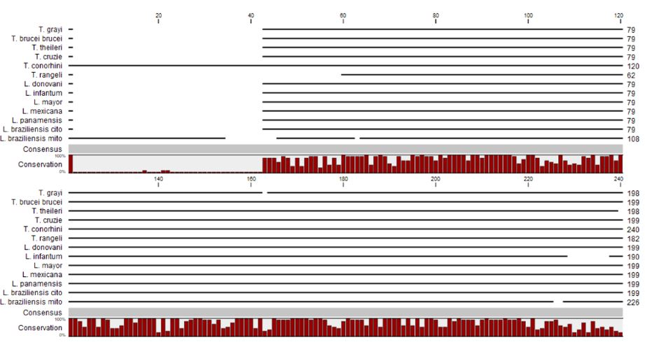 El alineamiento múltiple realizado a partir de secuencias de ortólogos para la TXNPx en la familia Trypanosomatidae (géneros Leishmania y Trypanosoma) indicó que esta proteína es altamente conservada en dicho grupo de organismos (Figura 1). A excepción de los ortólogos de los parásitos T. conorhini y T. rangeli, el tamaño de la proteína es de 199 aa. Teniendo en cuenta la función fundamental que esta cumple en la neutralización de compuestos prooxidantes, los cuales pueden ser producidos de manera endógena por la cadena respiratoria o exógena como respuesta del hospedero a la infección, dos isoenzimas han sido identificadas en organismos como L. donovani y L. infantum ubicadas en citoplasma y mitocondria [42]. Para el caso de L. braziliensis, de Morais et al, en el 2013 identificaron la proteína mitocondrial designada como LbTXNPx [8]. Continuando con la caracterización de estas enzimas y utilizando servidores como Euk-mPLoc 2.0, SignalIP 5.0 y DeepLoc-1.0, se encontró a nivel in silico un nuevo candidato con posible localización citoplasmática denominado LbTXNPxII [43], [45].