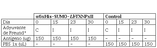 La proteína 6xHis-SUMO-LbTXNPxII purificada se utilizó para la inmunización de gallinas Lohmann Brown de 35 semanas en el centro de producción avícola de la Facultad de medicina veterinaria de la Universidad Nacional de Colombia, sede Bogotá, bajo las condiciones de mantenimiento estándar para el trabajo animal. Monitoreando, de igual manera, un individuo control que se inoculó con PBS 1X (buffer fosfato salino). Las condiciones de inmunización utilizadas han sido reportadas en la literatura y estandarizadas en el Laboratorio de Investigaciones Básicas en Bioquímica – LIBBIQ [29]. La primera inoculación se realizó homogenizando con vortex a velocidad 8 (Vortex Genie 2, VWR Scientific) la proteína antígeno (150 µg) con adyuvante completo de Freund en relación 1:1, esto por vía intramuscular (día 0) y, luego, se realizaron tres posteriores refuerzos: el primero post-15 d y los siguientes con intervalos de 8 d, inoculando el antígeno con adyuvante incompleto (relación 1:1) [30] (Tabla 1). En cada caso se inocularon 300 μL de homogenizado. Igualmente, desde el día 0 se recolectaron los huevos y muestras de sangre periférica para analizar sueros preinmunes e inmunes posteriores a cada inoculación [31].