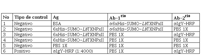 Por otro lado, con respecto a los α6xHis-SUMO-LbTXNPxII extraídos de yema de huevo, se realizó su titulación mediante ELISA indirecto en placas de 96 pozos en lector de placas (BioTek ELx8000). Para esto el antígeno (6xHis-SUMO-LbTXNPxII) se preparó en buffer carbonato (carbonato/bicarbonato) pH 9,6 a una concentración de 10 µg/mL, sembrando 100 µL/pozo, esto se incubó durante 1 h a 37 °C (LabTech) y O/N a 4 °C en nevera (cubriendo la placa con papel vinipel y aluminio). Al día siguiente se realizó el bloqueo adicionando 200 µL de leche descremada 5% p/v en PBS 1X durante 2 h a 37 °C; seguido se permitió interacción con el anticuerpo primario α6xHis-SUMO-LbTXNPxII en una dilución 1:500 durante 2 h a 37 °C y, posteriormente, se agregaron 100 µL del anticuerpo secundario αIgY-HRP (Sigma) en una dilución 1:8000 preparado en PBS 1X, incubando durante 2 h a 37 °C. El revelado de la placa se realizó con 2,2'-azino-bis (3-etilbenzotiazolina-6-ácido sulfónico) (ABTS - Sigma) y peróxido de hidrógeno en buffer citrato-fosfato 100 mM pH 5,0 incubando durante 1 h a 37 °C, siendo detenida la reacción con 20 µL de SDS 1%. Entre cada paso la placa se lavó por aspersión abundante con PBS 1X por lo menos 3 veces. Finalmente, se registró la absorbancia a 405 nm.