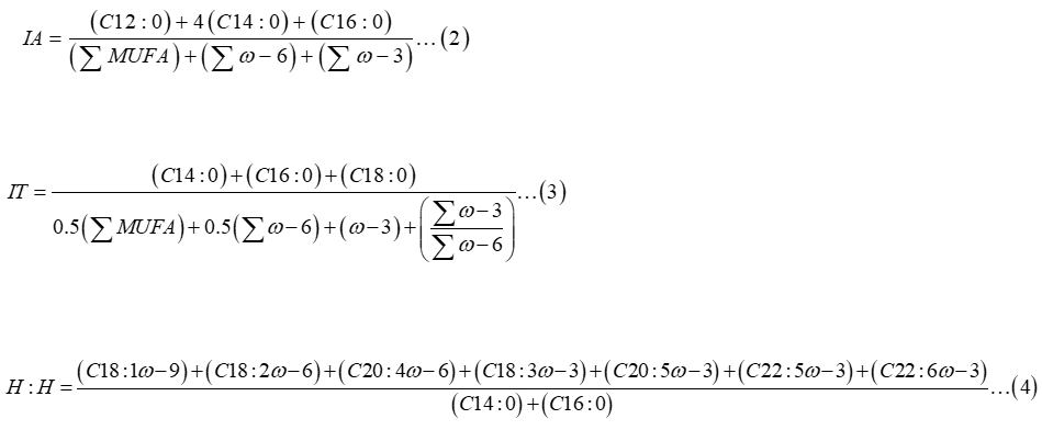 The fatty acid profile of grape seed oil was used to determine the index of atherogenicity (IA) and the index of thrombogenicity (IT) according to equations 2 and 3, respectively [6]. The hypocholesterolaemic: hypercholesterolaemic ratio (H:H) was assessed according to equation 4 as defined by Santos-Silva et al. [8] in order to evaluate the nutritional value of fat. The IA and IT values close to zero are considered advantageous in the prevention of coronary heart disease [7] and higher H:H ratios are beneficial on lipid products for human consumption because H:H ratios are associated with the benefits of high-density lipoproteins as stated by Pinto et al. [14].
