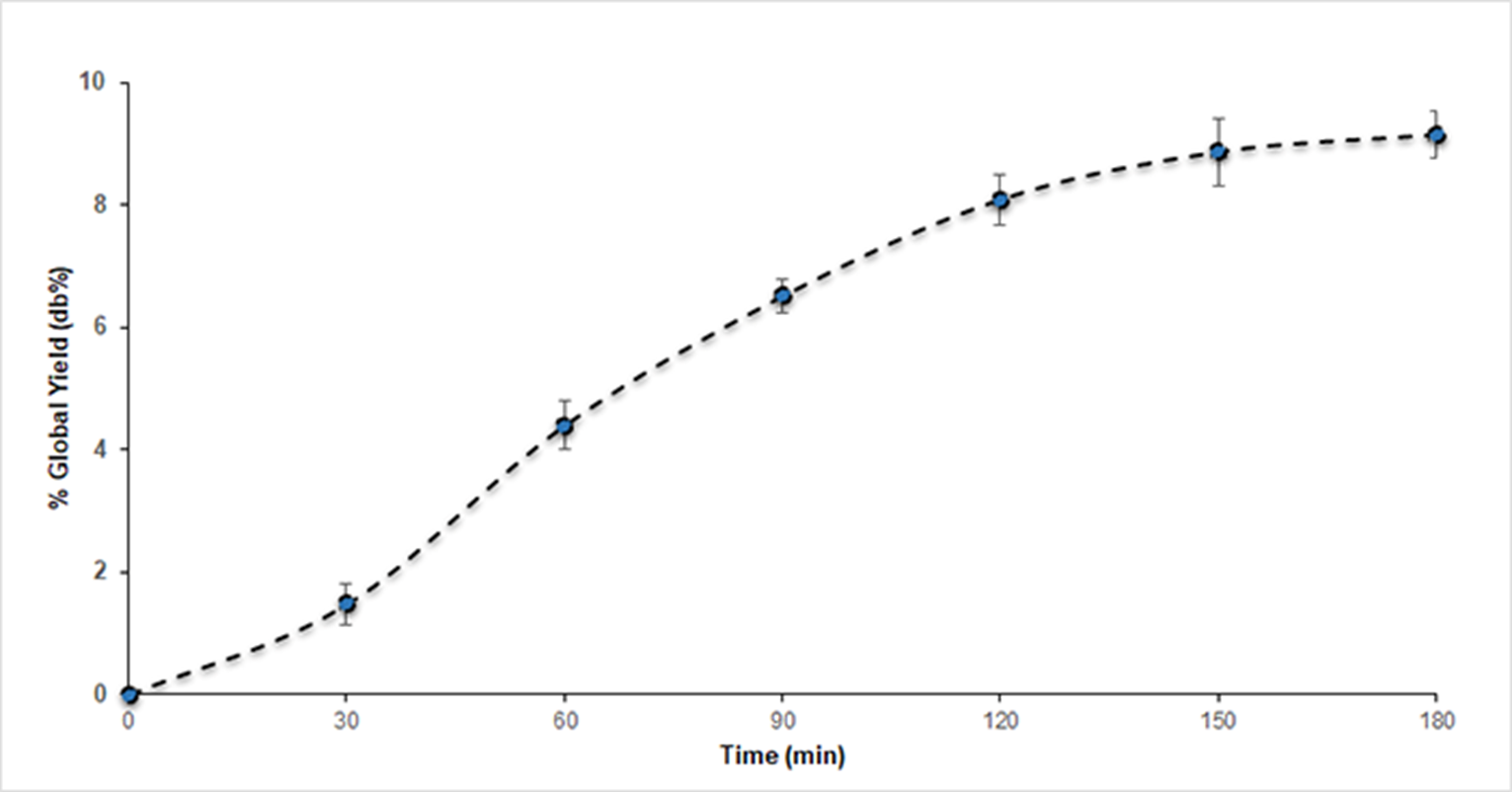 Figure 1. Global grape seed oil yield (db%) vs. time (min) during Borgoña grape (Vitis labrusca) seed oil extraction by supercritical CO2 at 33 °C and 188 bar.