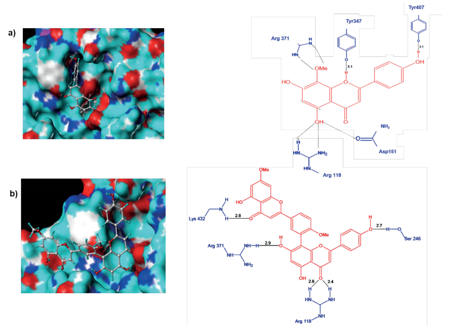Por otro lado, el ligando 6R a diferencia de 5R se acomoda en el sitio activo de H5N1 a través del sustituyente de ácido siálico de la posición R1 y una pequeña porción del biflavonoide (figura 11b). El análisis de interacciones mostró que el sustituyente ácido siálico de R1 estableció seis puentes de hidrógeno con la cavidad (Try406, Arg371, Arg292, Arg118, Asp151), mientras que dos con la parte flavonoide (Tyr347 y Ser 246). Los contactos hidrofóbicos fueron mediados por la cadena apolar del ácido siálico y Asp 198, Ile222 y Asn221. La suma de las interacciones evidencia la estabilidad del complejo mostrado en la figura 11b.