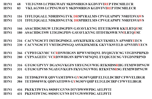 Por su parte, la búsqueda por homología en la PDB (algoritmo Blast) reportó una sola neuraminidasa de tipo N1, que coincidió con la H5N1 considerada en este estudio (PDB: 2HTY). El alineamiento de las secuencias procedentes de H1N1 y H5N1 mostró un porcentaje de identidad del 88%, valor que muestra la alta conservación de la estructura primaria en ambas proteínas, así como la utilidad del método para la predicción de estructuras terciarias. Además, al comprar las secuencias de ambas proteínas en torno al sitio activo se encontraron 11 aminoácidos altamente conservados (Figura 2).