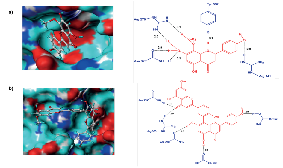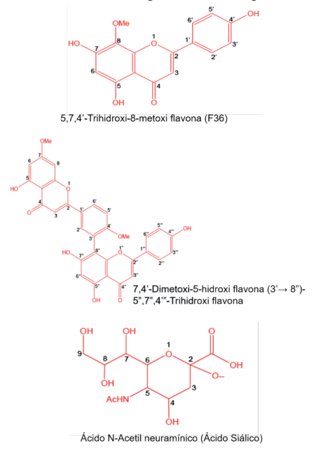 Resumo: O vírus influenza A é responsável pela gripe aviária; condição patológica que afeta principalmente pássaros, cavalos e mamíferos marinhos, no entanto, o subtipo H5N1 tem a capacidade de infectar humanos rapidamente; assim, expondo-os a um possível evento pandêmico. Portanto, o objetivo deste estudo foi realizar o acoplamento e modelagem de homologia tridimensional de flavonóides derivados da amentoflavona com as neuraminidases H1N1 e H5N1 do vírus da influenza aviária. Inicialmente, a estrutura 3D da neuraminidase H1N1 foi obtida por homologia. Em seguida, o acoplamento molecular de H1N1 foi realizado com seis ligantes (F36, Ginkgetin, 3S, 3R, 5S, 5R, 6S e 6R) e, posteriormente, H5N1 e os ligantes F36, Ginkgetin, 5R e 6R. Finalmente, uma análise de interação foi realizada nos complexos obtidos. Os resultados mostraram uma relação entre a atividade inibitória e as interações hidrofóbicas e do tipo ponte de hidrogênio formadas entre o sítio ativo das neuraminidases e os ligantes. Além disso, foi observada uma melhoria na atividade inibitória dos ligantes para a estereoquímica do tipo R e pequenos substituintes volumosos. Assim, é proposta a avaliação experimental dos ligantes 5R e 6R como potenciais inibidores do H5N1.