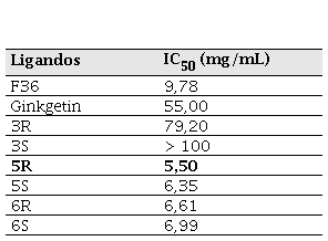 A diferencia del acoplamiento molecular con H1N1, el estudio proteína-ligando con H5N1 NA se llevó a cabo con cuatro ligandos, debido a que solo tres de ellos mostraron alta potencia inhibidora (F36, 5R, 6R) y en el caso de Ginkgetin, a pesar de no ser un buen inhibidor, fue seleccionado como elemento de comparación.