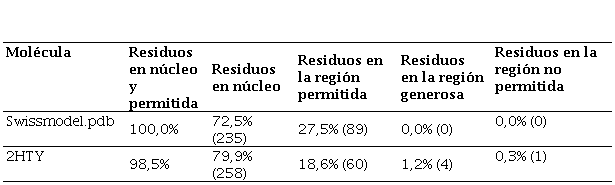 La evaluación de calidad por estereoquímica indicó también la estabilidad tanto del modelo como del molde (2HTY) (Tabla 4). Los valores mayores al 90% indican las regiones favorecidas del diagrama de Ramachandran, considerando la estereoquímica Phi-Psi. Además, la tabla 3 muestra que en el Swiss Model no presentó ningún aminoácido con una conformación inconcebible, mientras que para el 2HTY solo un aminoácido adoptó dicha conformación, no obstante, este no hace parte del sitio activo ni es un residuo cercano. También, la calidad del modelo por normalidad (Z-score) mostró que la estructura generada por el Swiss Model y el molde están dentro de los Z-score de las proteínas nativas reportadas en la Protein Data Bank. Por tanto, todos los parámetros considerados en la evaluación del molde y el Swiss Model indicaron su estabilidad y geometría favorable para su utilización en los ensayos de acoplamiento molecular.